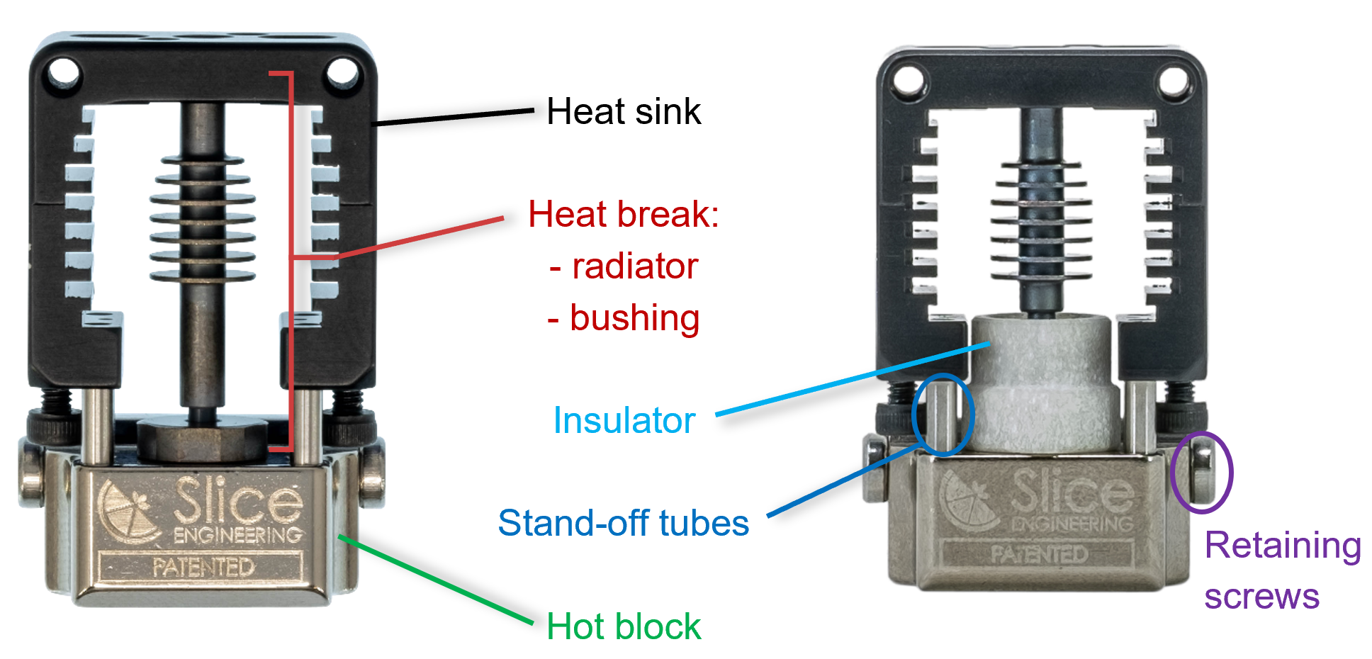 that of monolithic all-metal heat breaks. Mosquito’s supremely thin-walled heat break minimizes the undesirable flow of heat upward from the melt zone along the filament path. Yet Mosquito™ is still the most rugged hot end available, because its heat break doesn’t serve as a structural element as heat breaks do in all other hotends. The Mosquito heat break features multi-body, bimetallic construction that places a copper alloy (thermal conductivity: 320 W/mK) where heat flow is desired and a stainless-steel alloy (thermal conductivity: 15 W/mK) where it isn’t.