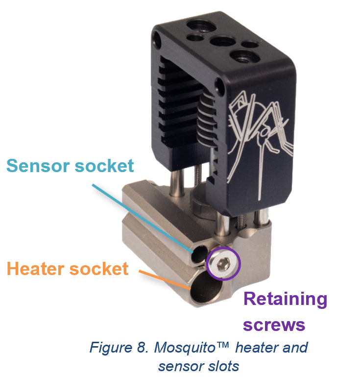 A low-quality cartridge heater may have a substantially oversize (out of specification) outer diameter and not fit Mosquito. If the heater inserts easily, use it, otherwise replace it. Do not force an oversize heater into the cartridge heater slot in the Mosquito.