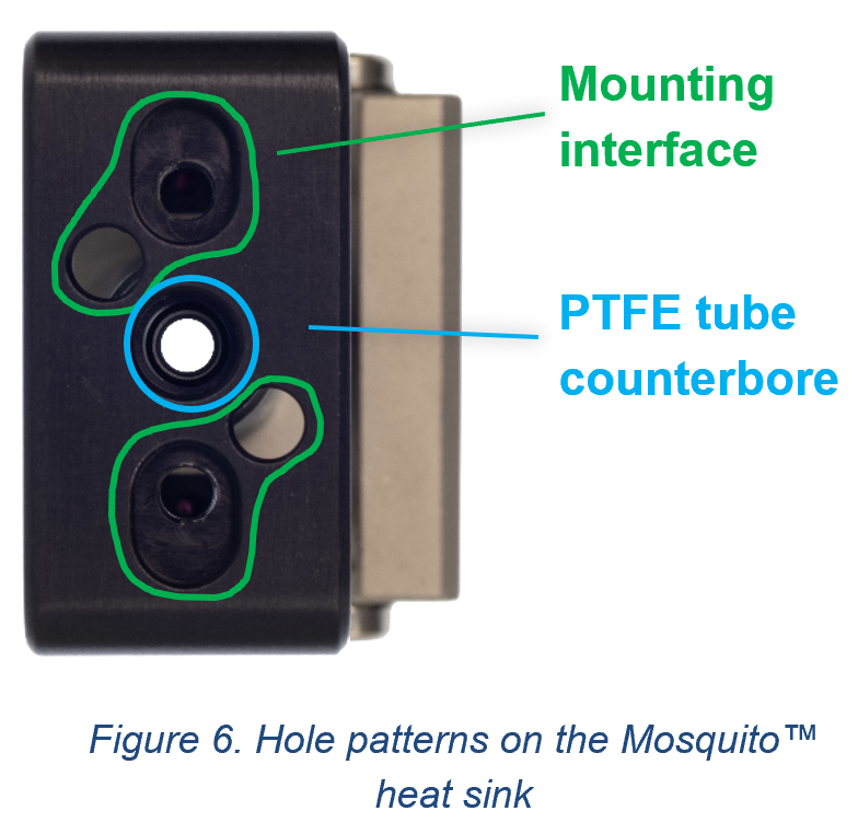 Mosquito’s black aluminum heatsink features a pair of M2.5x0.45 tapped holes and M2.5 counterbored clearance holes for mounting to its top surface (see Fig. 6) and a pair of M2.5x0.45 tapped holes for mounting to its bottom surface. Any of these three pairs of holes may be used to mount Mosquito to your machine. The M2.5 clearance holes may be used with M2.5x0.45 socket head cap screws, or if fastening Mosquito to a plastic component, with special M2.5 thread-forming screws for plastic.